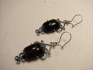 Dieses Paar Ohrhänger ist aus geschwärztem Silber gefertigt. Sie sind mit einem filigranen Muster gestaltet. Im Zentrum sitzt ein roter Glasstein.